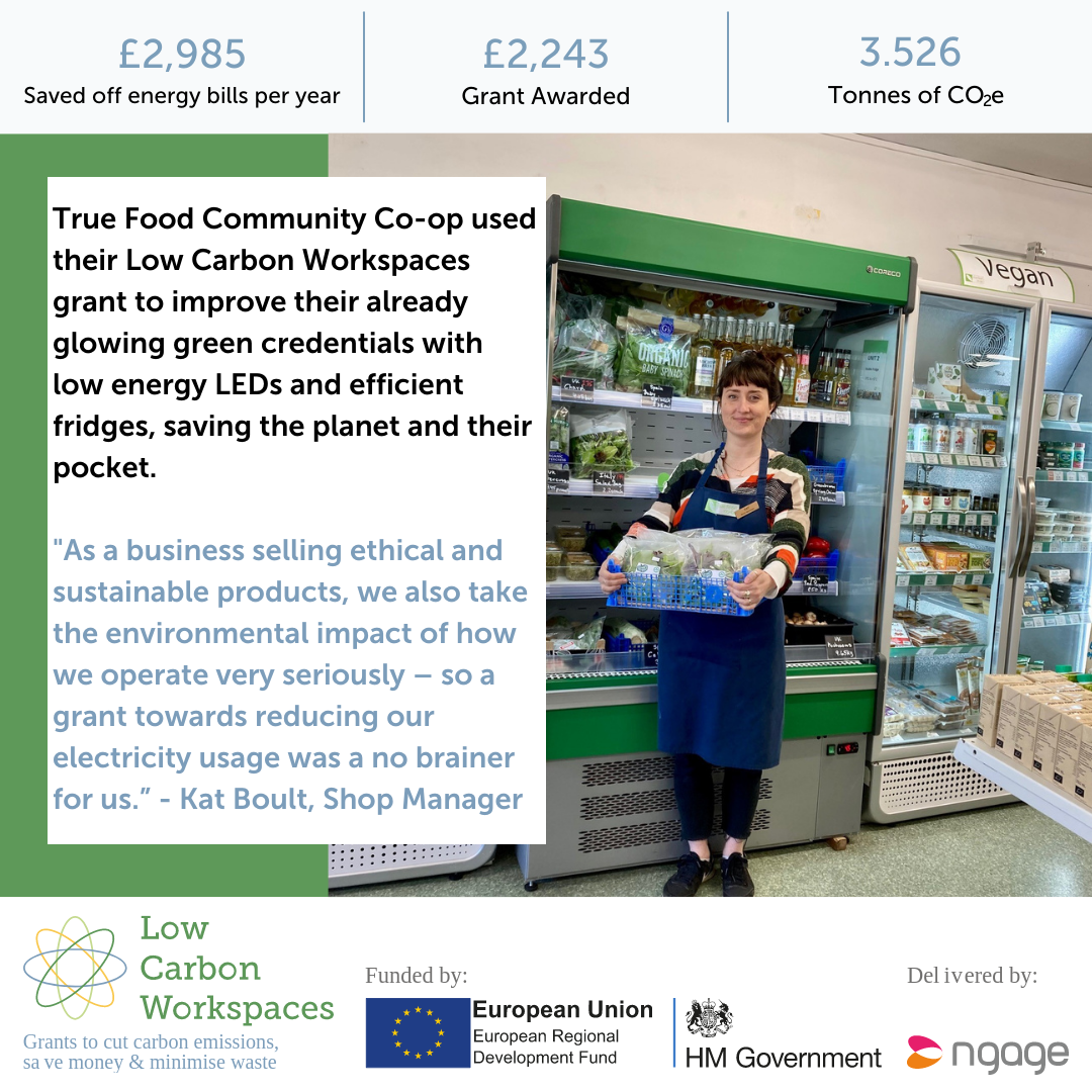 With Low Carbon Workspace’s grant True Food Community Co-op were able to improve their green credentials even further by installing low energy LED’s and fridges, saving the planet with their pocket. This means they will save £2985 off their energy bills per year.